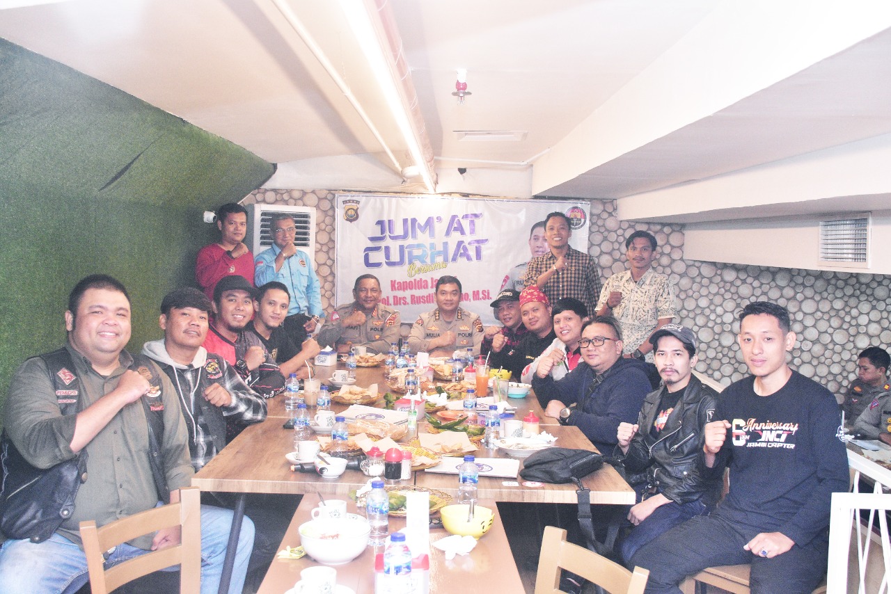 Jurnal1jambi.com – Pelaksanaan jum’at curhat yang dilaksanakan di Best Kopi Tiam, Mall Lippo Jambi tersebut dipimpin oleh Dirlantas Polda Jambi Kombes Pol. M. Dhafi dengan di dampingi oleh Kabid Humas Polda Jambi Kombes Pol. Mulia Prianto dengan dihadiri peserta oleh club motor di Kota Jambi.