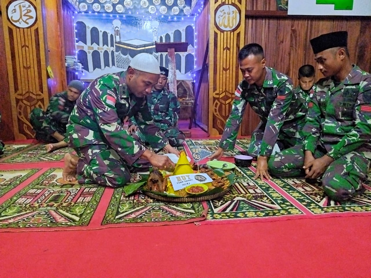 Pelaksanaan Doa bersama dengan pembacaan Alquran (Yasin bersama), dilanjutkan dengan pemotongan Nasi Tumpeng yang dilakukan oleh Danyonif Raider 142/KJ Letkol Inf Esnan Haryadi.