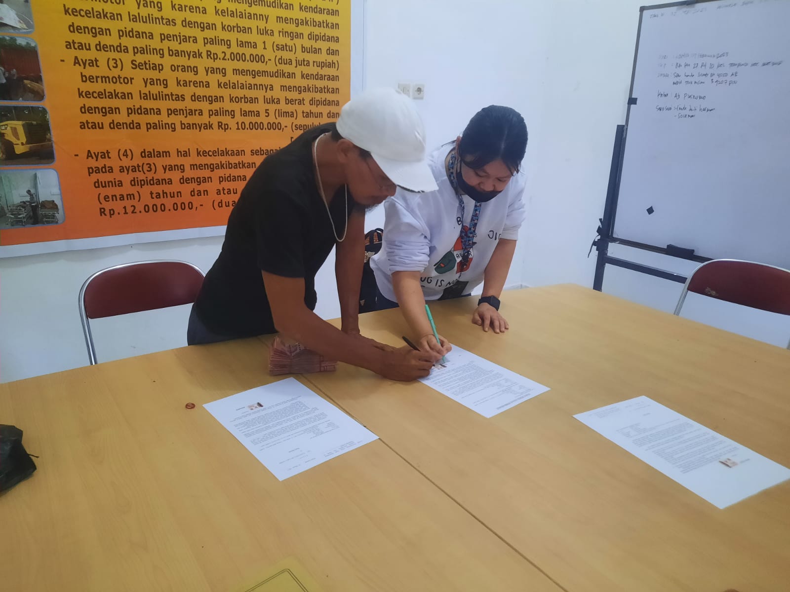 Dalam penanda tanganan surat perdamaian tersebut, mobil Panther pickup disaksikan langsung oleh pemilk mobil rojali dan pemilik mobil tronton Yenny Lusia.(Wandy)