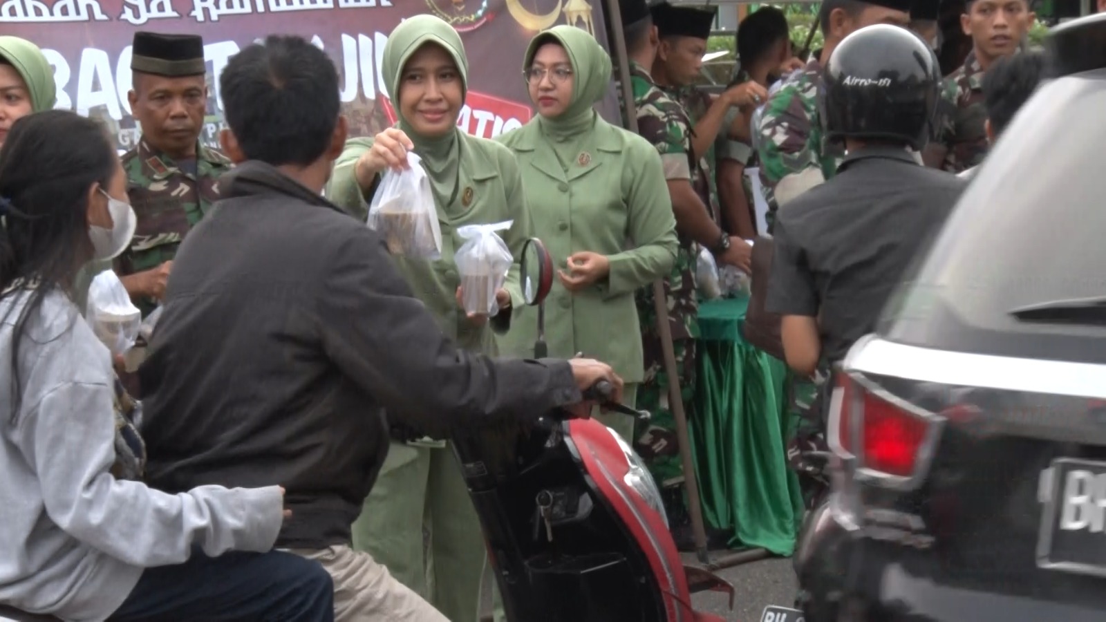 Tampak para Prajurit dan Ibu-ibu Persit secara bergantian membagikan ratusan paket takjil kepada pengguna jalan yang melintas depan Makorem, ungkap Kapenrem.