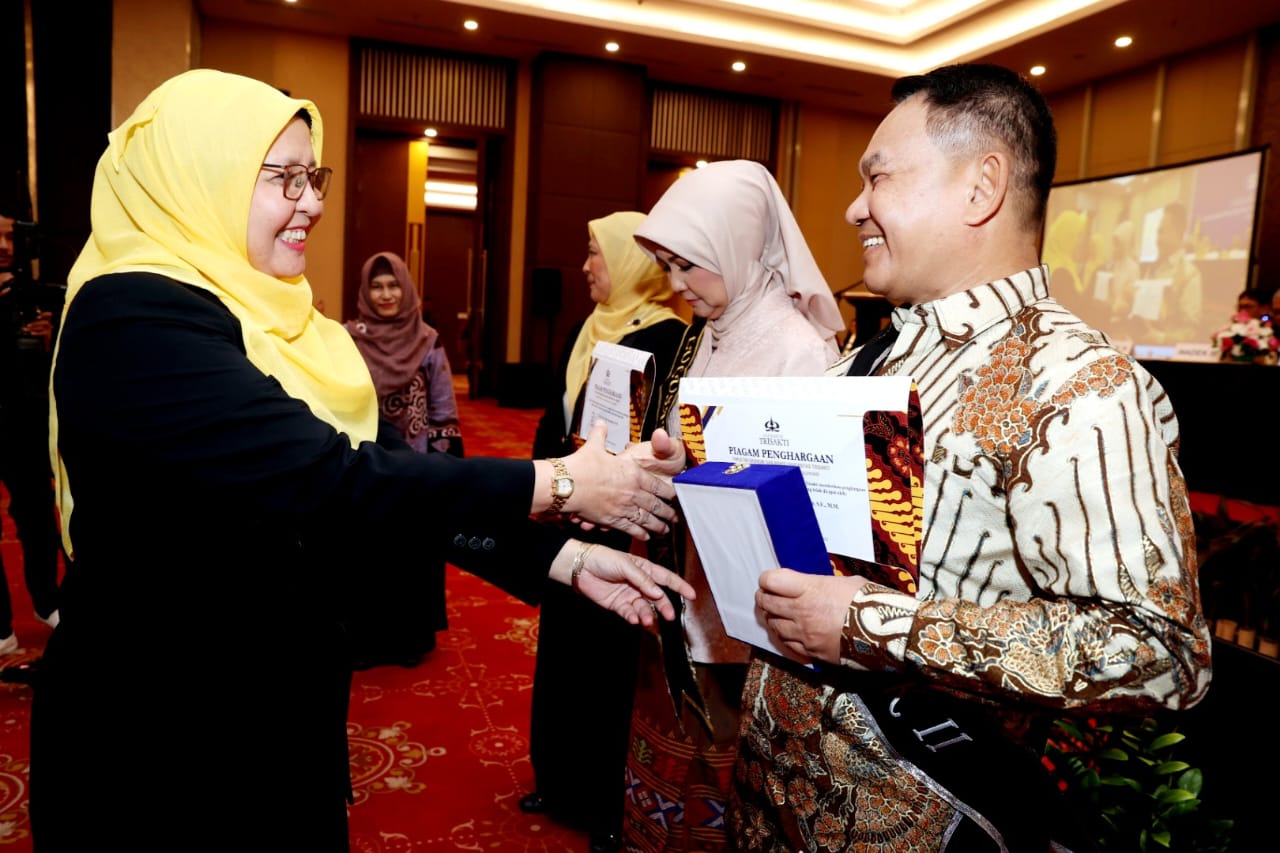 Rektor Universitas Trisakti juga memberikan piagam penghargaan serta selempang pada para lulusan terbaik serta pemberian ucapan selamat dari para Wakil Rektor, Guru Besar, Dekan dan Wakil Dekan FEB Universitas Trisakti, Kaprodi dan Ketua Alumni FEB Univeritas Trisakti Muhamamd Arif Pahlevi Pangerang. (Wandy/Dispenad)