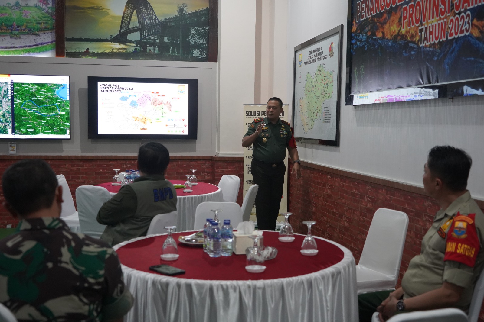 Pada kesempatan tersebut, di waktu yang singkat Ka BNPB RI mengunjungi Posko Karhutla di Makorem 042/Gapu, Danrem selaku Plh. Dansatgas Karhutla menjelaskan Isi data-data yang ada di posko antara lain Kondisi Wilayah Provinsi Jambi, ancaman El nino, peta sebaran titik api dan juga potensi kerawanan yang akan timbul serta mekanisme Komando pengendalian Posko satgas kepada subsatgas darat dan udara.