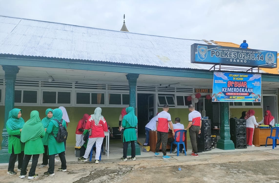 Dijelaskan Pasi Ops, bahwa semarak kemerdekaan masih terasa dan sebagian masih berlangsung seperti pagi ini. Acara pagi ini di mulai dengan apel bersama, pemeriksaan kesehatan di lanjutkan dengan senam bersama dan di akhiri dengan pengundian doorprize berhadiah. Selain itu juga di adakan pengecekan tekanan darah, pengecekan gula darah secara gratis oleh tim kesehatan Polkes 02.10.14 Bangko untuk masyarakat umum.