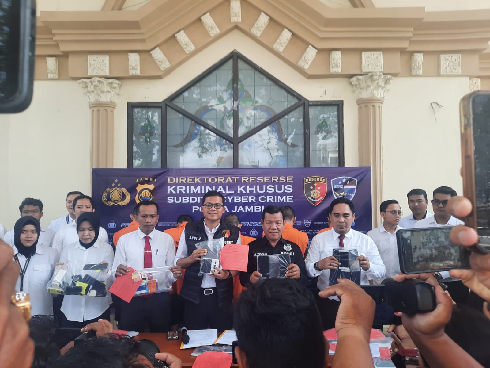 Sementara itu Kasubdit Cyber Ditreskrimsus Polda Jambi Kompol Andi Purwanto menambahkan Delapan orang yang diamankan ini masih kita lakukan pemeriksaan yang mana berdasarkan keterangan para pelaku bahwa untuk korbannya sendiri tidak hanya di Provinsi Jambi saja namun ada juga dari luar Provinsi Jambi.