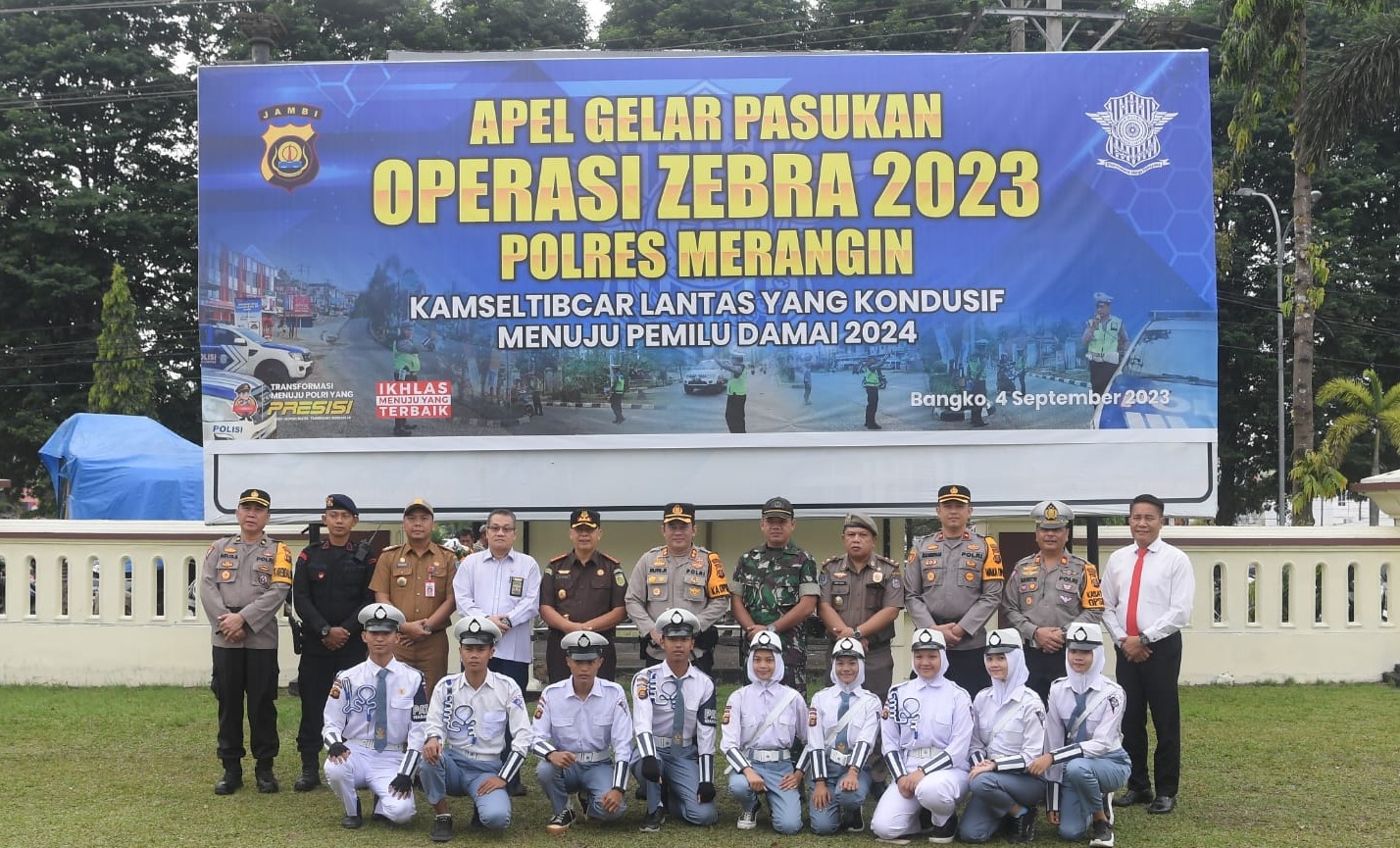 Jurnal1jambi.com, Senin 4 September 2023,-Bertempat di lapangan Mapolres Merangin, pagi ini berlangsung apel gelar pasukan operasi zebra 2023, di ikuti oleh TNI-Polri, Sat Pol PP Merangin, Dishub dan para pelajar, serta tamu undangan lainnya.