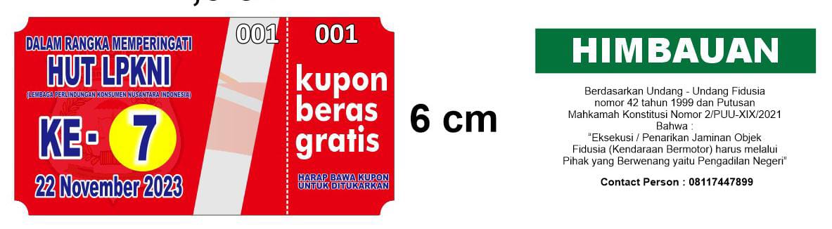 Kurniadi Hidayat Ketua umum LPKNI mengatakan, Dalam Memeriahkan HUT LPKNI yang ke – 7 Lembaga Perlindungan Konsumen Nusantara Indonesia (LPKNI) mengadakan acara Bakti Sosial dengan Berbagi Kupon Beras Gratis kepada masyarakat.