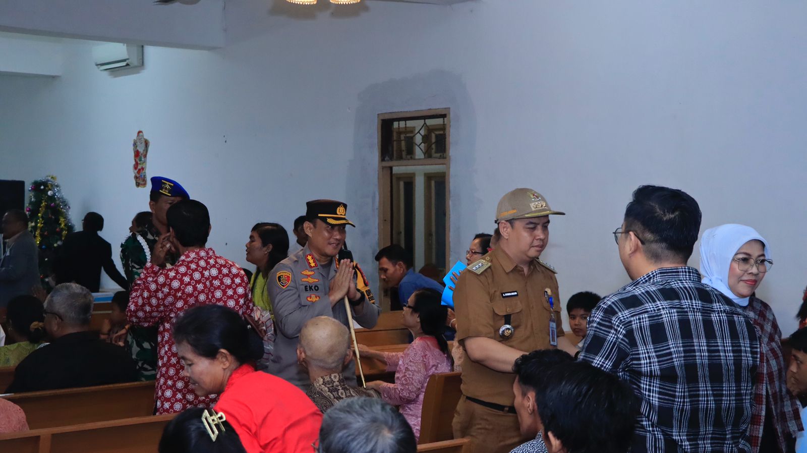 Jurnal1jambi.com .Pj Walikota Jambi Sri Purwaningsih, bersama Kapolresta Jambi Kombes Pol Eko Wahyudi, SIK, MH., Dandim 0415/Jambi Letkol Arm Eko Pristiono, SH, M.I.Pol., Wakil Ketua II DPRD Kota Jambi Ibu Roro Nully Kurniasih, SE., Kakanwil Kemenag Kota Jambi H Abdul Rahman, S.Ag, M.Pd.I., Ketua FKUB Kota Jambi H Husin Abdul Wahab., Wadandenpom II/2 Jambi Mayor CPM Syahrial., Staf Ahli Walikota Jambi Bidang Pemerintahan Hukum dan Politik Bpk Drs Mulyadi Yatub, SH., Kaban Kesbangpol Kota Jambi Bpk Drs Raden Jufri, ME., dan Kasat Pol-PP Kota Jambi Bpk Feriadi, memantau langsung pelaksanaan Perayaan Natal tahun 2023 ke Sejumlah Gereja yang ada di Kota Jambi, Minggu malam (24/12/2023).