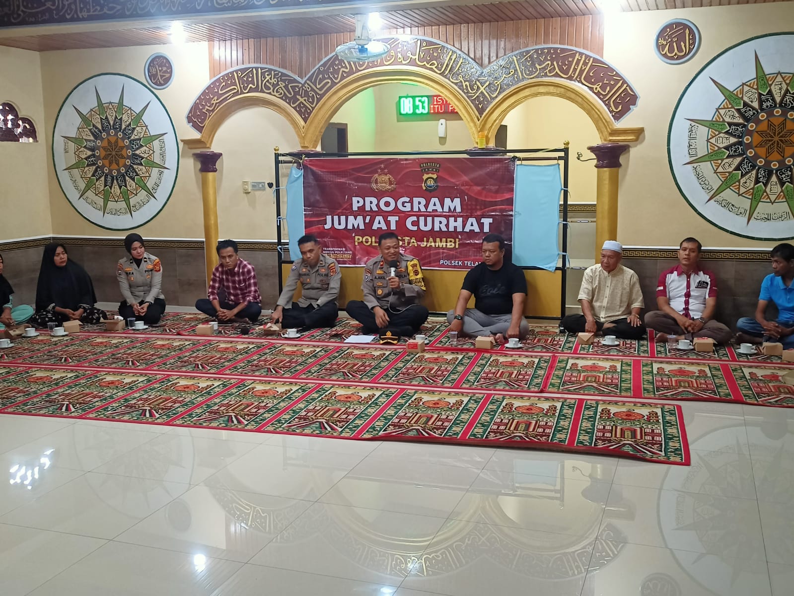 Kasi Humas Polresta Jambi Ipda Deddy Haryadi, menambahkan; kegiatan Jum’at Curhat dihadiri oleh; Kasat Binmas Kompol Abdul Akil, SH., KBO Sat Binmas Ipda Wira Aswita Guci, SH., Ps.Kanit BKTM Sat Binmas Ipda Syahrial., Panit Binmas Polsek Telanaipura Ipda TB Sirait dan Bhabinkamtibmas Kelurahan Murni Aipda Hendri., kemudian pihak Pemerintah Kelurahan Murni dihadiri oleh; Lurah Murni Adi Kurniawan., Ketua Forum Rukun Tetangga (RT) Edi Susanto., Ketua Rt. 10, 13 dan Ketua Rt. 15., perwakilan Toga, Tomas dan masyarakat seputaran Mushola.