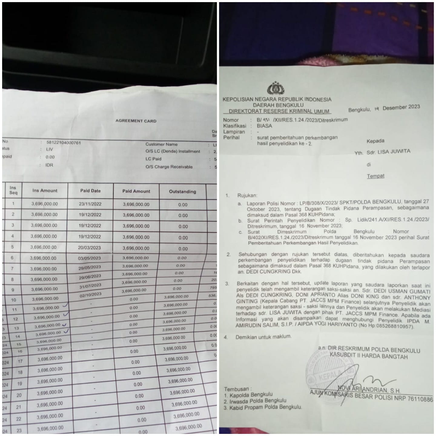 Setelah Kejadian tersebut,korban melaporkan kejadian tindakan perampasan oleh Debcollector tersebut ke Polda Bengkulu,namun Sampai Berita ini diturunkan belum ada penyelesaian dan belum ada Yang Dijadikan Tersangka(TSK) oleh Polda.