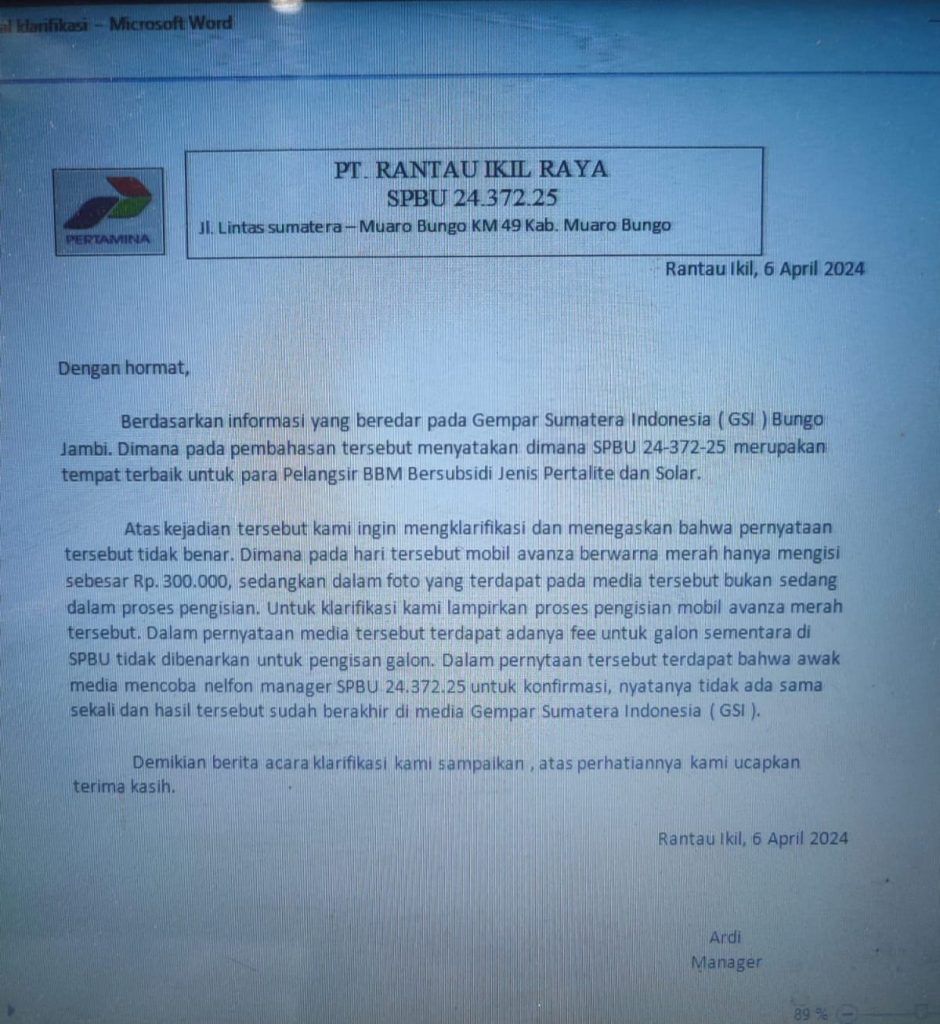 Dikutip dari berita yang beredar pada media Gempar Sumatera Indonesia (GSI) Bungo Jambi pada tanggal 06 April 2024 Mengenai ada nya tindakan pelanggaran pelangsiran BBM bersubsidi berjenis pertalite dan solar, Pihak SPBU 24.372.25 Rantau ikil langsung angkat bicara dengan mengeluarkan surat berita acara mengenai klarifikasi dan menegaskan bahwa pernyataan tersebut tidak benar.