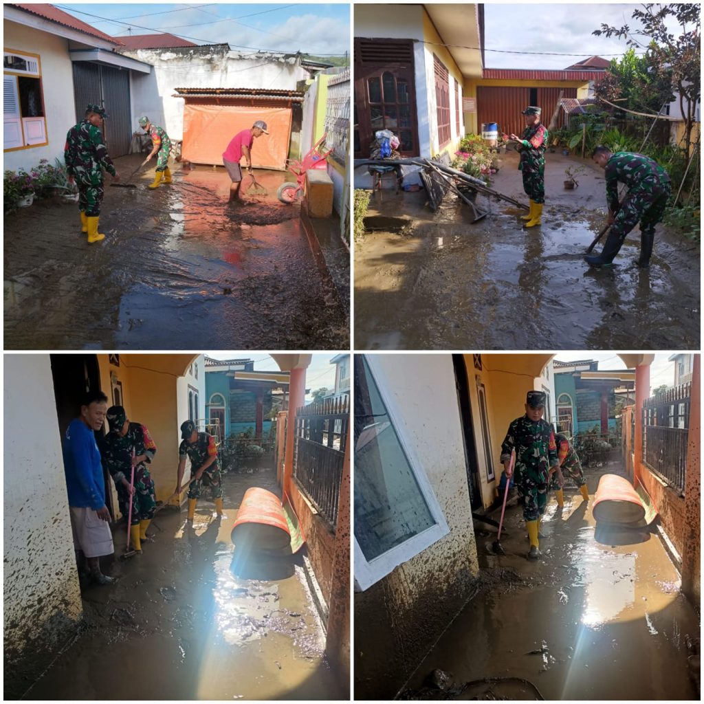 Tampak Danramil dan Babinsa bersama warga masyarakat gotong royong membersihkan rumah-rumah warga yang terdampak, jalan dan saluran air dari tumpukan lumpur akibat banjir semalam.