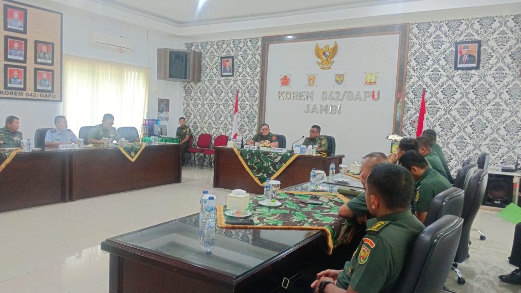 Kasrem 042/Gapu didampingi para Kasi Korem 042/Gapu dan Kasdim 0415/Jambi menerima kunjungan kerja dari Tim Puldata Kajian Strategis Bidang Ekkudag Sahli Panglima TNI yang dipimpin Brigjen TNI Dr. Eko Nursanto, S.H., M.H selaku Wakil Ketua Tim di Ruang Rapat Makorem 042/Gapu, Jl. Jend Urip Sumohardjo, Kel. Sungai Putri Kec. Danau Sipin Kota Jambi, Selasa (4/6/2022).