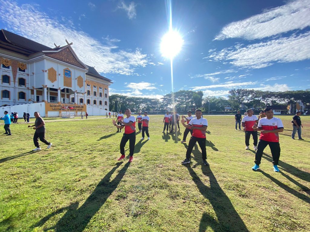 Senam bersama ini dimulai dengan pemanasan ringan yang dipimpin oleh instruktur senam profesional. Peserta senam, yang terdiri dari aparat pemerintahan, TNI, Polri, serta berbagai perwakilan organisasi, mengikuti gerakan-gerakan senam dengan penuh semangat. Acara ini berlangsung meriah dan diiringi dengan musik yang energik, menambah semangat para peserta.