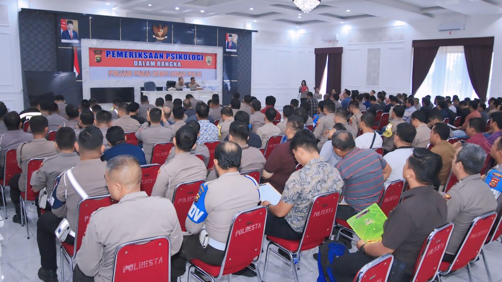 Jurnal1jambi.com, Kepolisian Resor Kota Jambi menggelar test Psikologi kepada ratusan personel Polresta Jambi sebagai calon pemegang senjata api (senpi) kedinasan, test dilakukan secara langsung oleh Tim Psikologi Polda Jambi yang dipimpin Ps. Kabagpsi Biro SDM Polda Jambi Kompol Muhtar Efendi selaku ketua Tim Psikologi didampingi Kabag SDM Polresta Jambi Kompol Sopirin. Rabu 25 September 2024.