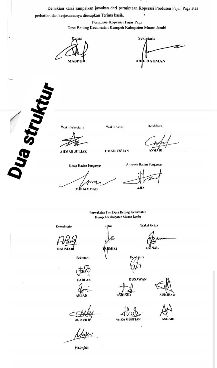 Jelas-jelas surat tersebut tidak di stempel atau cap atas nama koperasi Fajar Pagi sesuai kop surat. Pada bagian tanda tangan dan cap juga terdapat dua kelompok yaitu tanda tangan kelompok atas nama koperasi Fajar Pagi yang terdiri dari nama Ketua MASPUR, sekretaris ABD.RAHMAN, wakil Sekretaris AHMAD JULIAZ, wakil ketua UMAR USMAN, bendahara ASMADI, ketua badan pengawas MUHAMMAD, anggota badan pengawas AJIZ. Dan tanda tangan atas nama kepengurusan tim perwakilan desa Betung kecamatan kumpeh kabupaten Muaro Jambi dalam satu surat tersebut yang terdiri dari, Ketua TARMIZI, koordinator RAHMADI, Wakil Ketua ZAINAL, sekertaris FADLAN, bendahara GUNAWAN, yang mencantumkan nama dan tangan tanpa jabatan, ARPAN, BAIHAKI, SUKIRNO, M NUR D, WIKA GUSTIAN, ASKARI, MARYADI.
