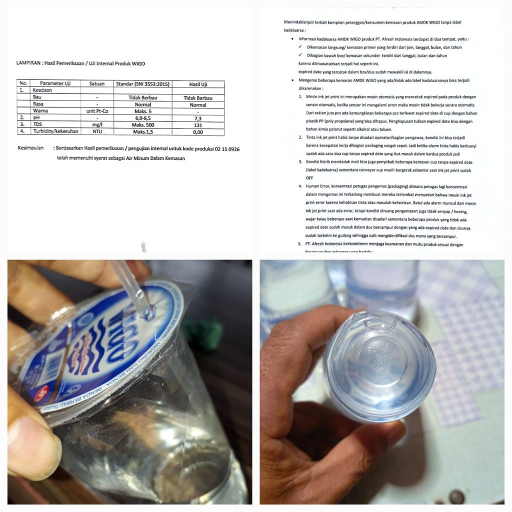 Yang mana pada sebelumnya telah beredar berita bahwa Air mineral kemasan gelas dengan merk Wigo yang diproduksi PT Afresh Indonesia diduga tidak memiliki tanda expired,warga ragukan kualitas air mineral.