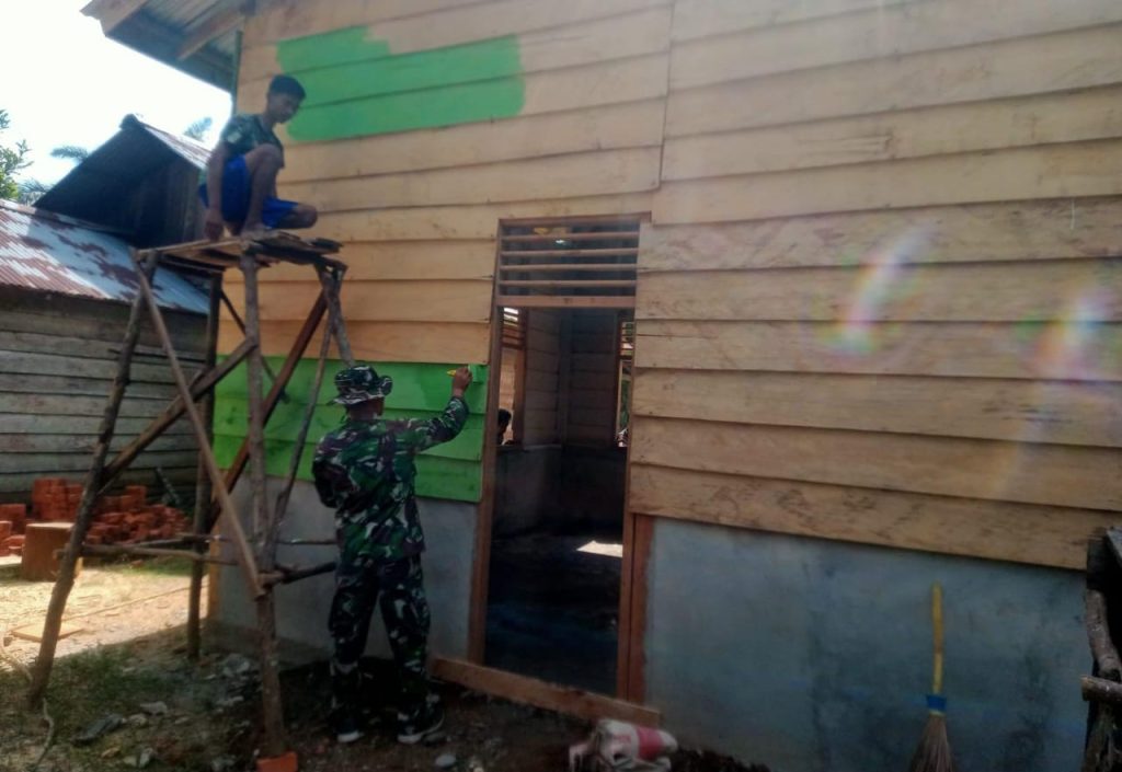 Kegiatan ini dimulai pada pagi hari dengan melibatkan warga setempat, menciptakan semangat kebersamaan yang tinggi. Anggota Satgas tidak hanya melakukan pengecatan saja namun juga memplester rumah Supardi.
