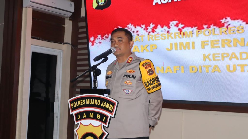Penyampaian Kasat Reskrim Polres Muaro Jambi AKP Hanafi Dita Utama, S.T.K., S.I.K. “Saya mengucapkan terima kasih atas kesempatan dan amanah yang diberikan kepada saya untuk bergabung sebagai bagian dari Polres Muaro Jambi. Sebuah kehormatan dan tanggung jawab besar untuk dapat melanjutkan tugas yang sebelumnya dijalankan dengan sangat baik oleh AKP Jimi Fernando, S.I.K.
