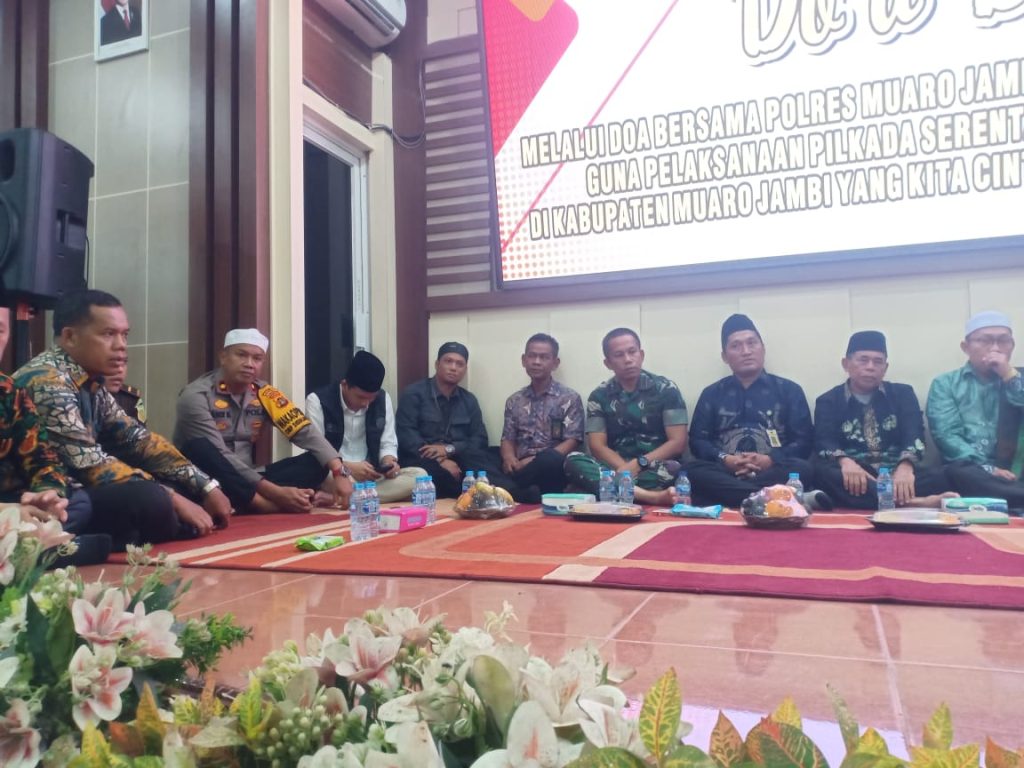 Jurnal1jambi.com-Dalam rangka menggelar doa bersama sukseskan pemilihan kepala daerah serentak 2024 aman dan damai berlangsung di aula wira pratama Polres muaro jambi, Kamis pagi 21/11/24