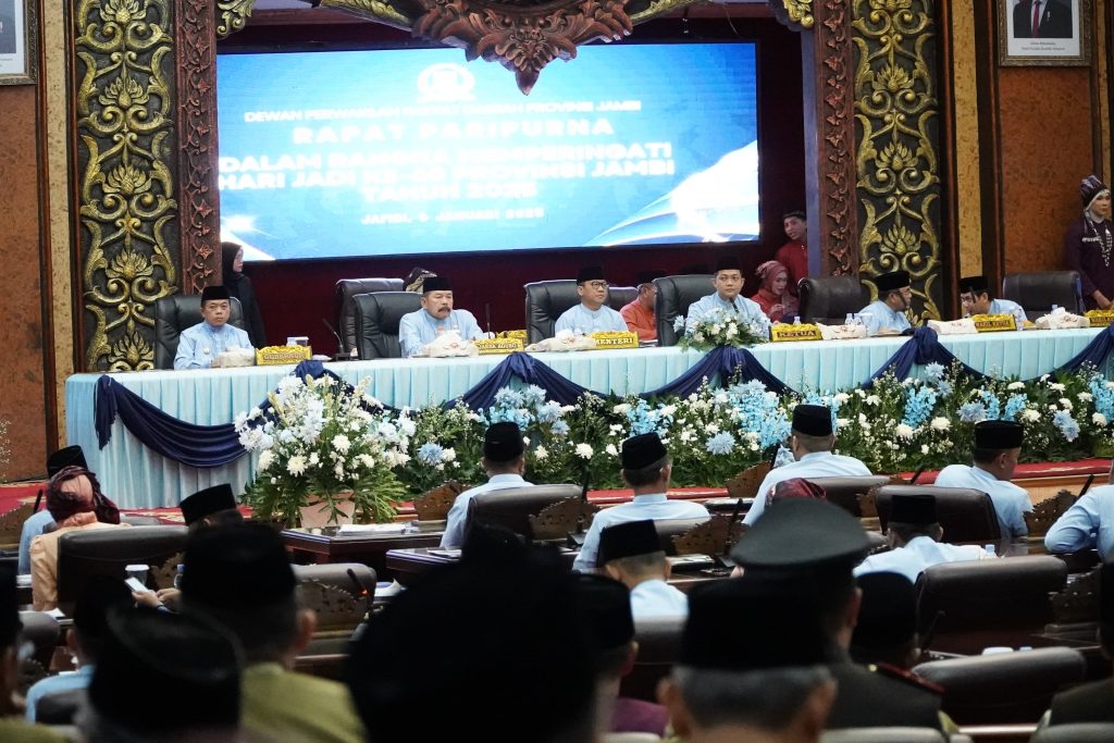 Jurnal1Jambi.Com,- Peringatan HUT ke- 68 Tahun Provinsi Jambi berlangsung di gedung Rapat Paripurna Provinsi Jambi ,Senin (06/01/25)