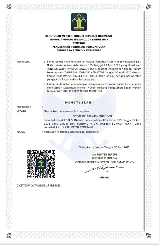 Jurnal1Jambi.Com,- FERADI MEDIATORE kini resmi menjadi organisasi berbadan hukum yang terdaftar di Kementerian Hukum dan Hak Asasi Manusia Republik Indonesia. Pengesahan ini menandai langkah penting bagi organisasi yang berkomitmen untuk mewadahi dan meningkatkan kualitas mediator di seluruh Indonesia. Dengan nomor pendaftaran AHU-0003295.AH.01.07.TAHUN 2025, FERADI MEDIATORE memiliki legalitas penuh untuk menjalankan berbagai kegiatan mediasi secara profesional dan terstruktur.