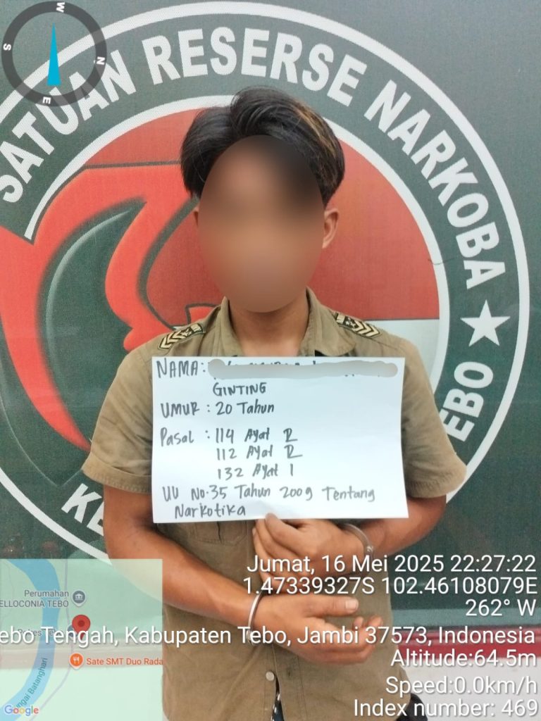 Ketiga tersangka masing-masing berinisial KT alias KRIS (42), I S (35), dan YN (20). Mereka ditangkap saat berada di salah satu rumah di RT 06 Desa Pemayungan sekitar pukul 12.00 WIB oleh Tim Opsnal Satresnarkoba Polres Tebo.