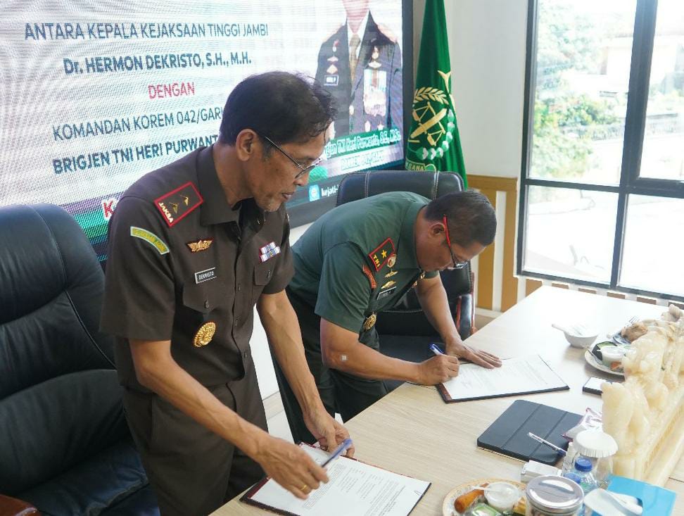 Jurnal1jambi.com, 22 Mei 2025 – Komandan Korem 042/Gapu Brigjen TNI Heri Purwanto, S.E., M.Sc., menghadiri kegiatan Penyerahan Surat Perintah dan Penandatanganan Berita Acara Pengamanan Kejaksaan Tinggi Jambi, Kejaksaan Negeri, serta Cabang Kejaksaan Negeri se-Wilayah Hukum Kejaksaan Tinggi Jambi. Kegiatan berlangsung pada Kamis (22/5/2025) pukul 14.30 WIB bertempat di Ruang Rapat Lantai IV Kejati Jambi, Jalan Jenderal A. Yani, Telanaipura, Kota Jambi.