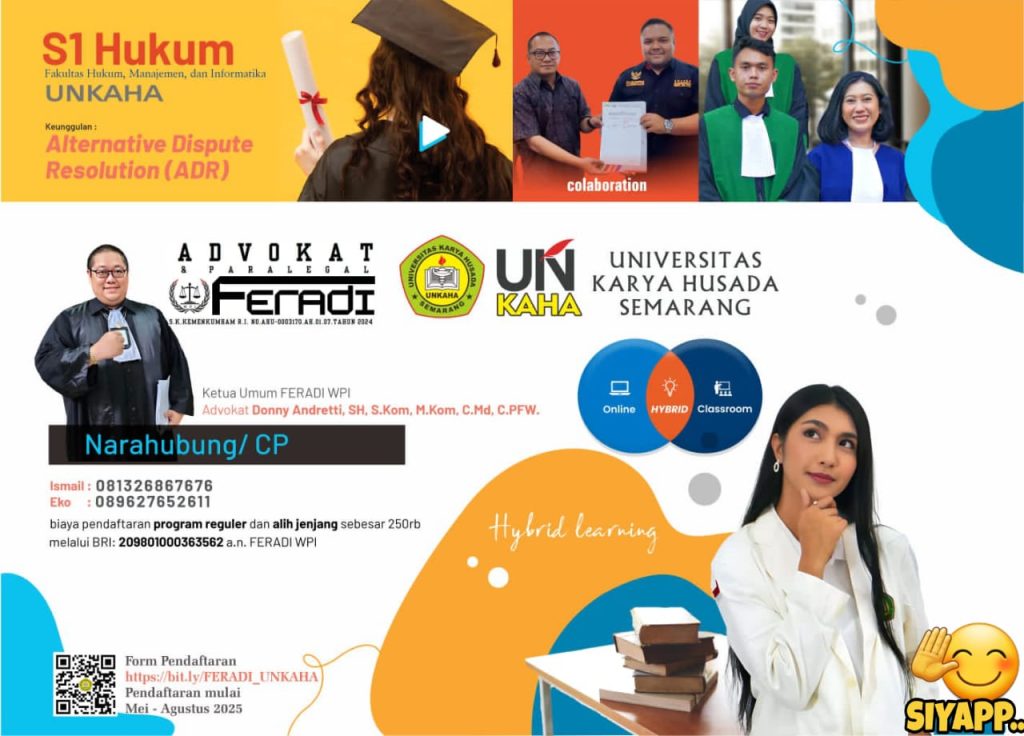 Pendaftaran dibuka sejak Mei hingga Agustus 2025 dan perkuliahan akan dimulai pada September 2025. Masyarakat yang tertarik dapat mengisi formulir online melalui bit.ly/FERADI_UNKAHA dan menghubungi narahubung yang tersedia. FERADI WPI dan UNKAHA percaya, perubahan besar dimulai dari keberanian untuk belajar. Karena hukum bukan milik segelintir elit, melainkan hak setiap warga untuk memahaminya—dan memperjuangkannya.