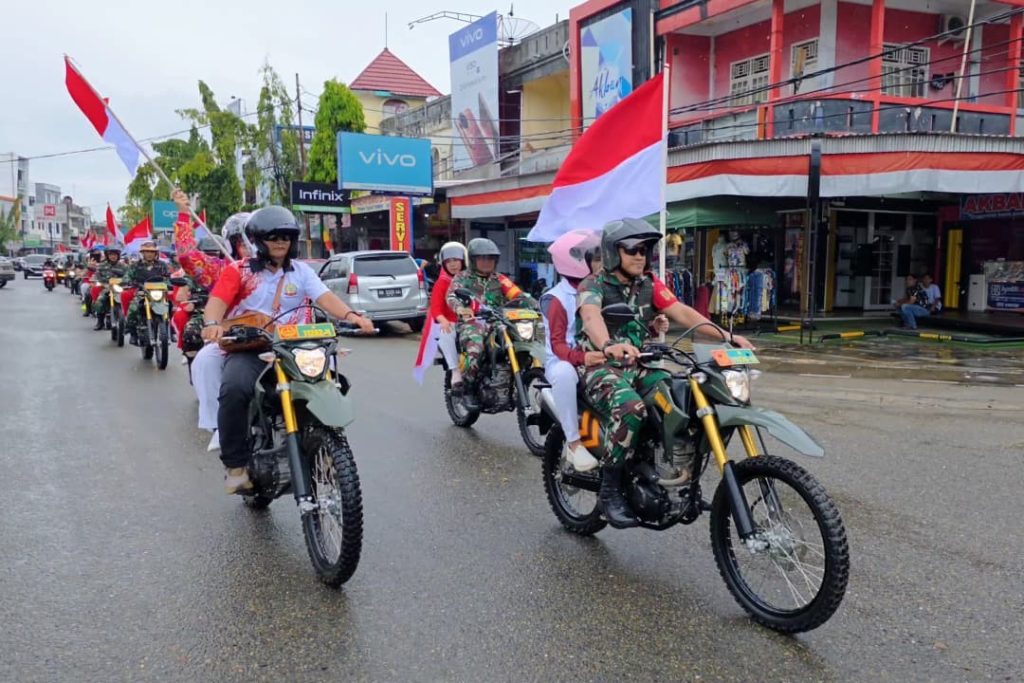 Jurnal1jambi.com,— Bungo — Hujan deras yang mengguyur sejak dini hari, Jumat (15/8/2025), tak mampu meredam semangat patriotisme keluarga besar Kodim 0416/Bungo Tebo. Menjelang peringatan HUT ke-80 Republik Indonesia, Komandan Kodim 0416/Bute Letkol Inf Dedy Pungky Irawanto, S.I.P., M.I.Pol., bersama Ketua Persit KCK Cabang XXIV Dim 0416 Ny. Vilana Pungky, memimpin langsung Patroli Merah Putih di Kota Muara Bungo. Kegiatan ini bukan sekadar memasang bendera, tetapi juga menyemai nilai kepedulian sosial melalui program Jumat Berkah.