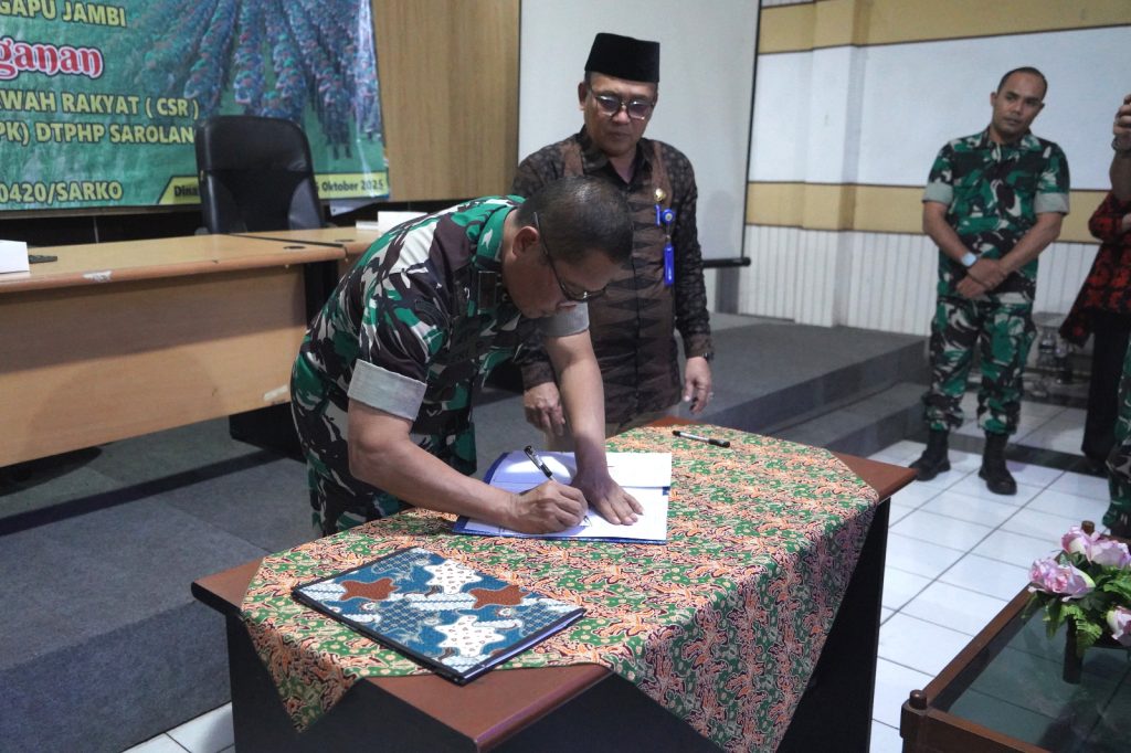 Kegiatan tersebut juga dirangkai dengan penandatanganan kontrak konstruksi CSR antara Pejabat Pembuat Komitmen (PPK) Dinas TPHP Kabupaten Sarolangun dan Komandan Kodim 0420/Sarko, Letkol Inf Yakhya Wisnu Arianto, S.Sos., M.Han. Acara berlangsung khidmat dan dihadiri berbagai pihak, di antaranya Kasiter Kasrem 042/Gapu, Asdatun Kejati Jambi, pejabat Dinas TPHP Kabupaten Sarolangun, serta perwakilan dari Ditjen Lahan dan Irigasi Pertanian (LIP).