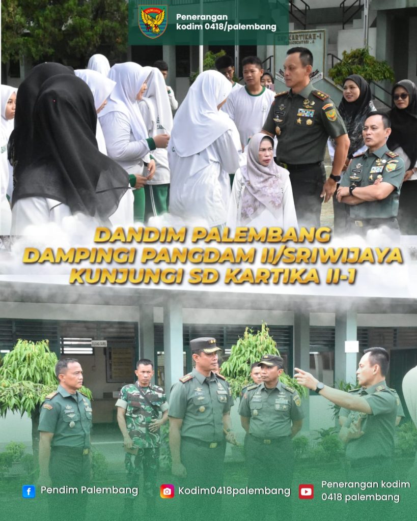 Jurnal1jambi.com,- PALEMBANG — Komandan Kodim 0418/Palembang Letkol Arh Erik Novianto, S.Sos mendampingi Pangdam II/Sriwijaya Mayjen TNI Ujang Darwis, M.D.A dalam kunjungan kerja ke SD Kartika II-1, yang berlokasi di Jalan Ratu Sianum, Kelurahan 3 Ilir, Kecamatan Ilir Timur II, Kota Palembang, Selasa (22/10/2025).