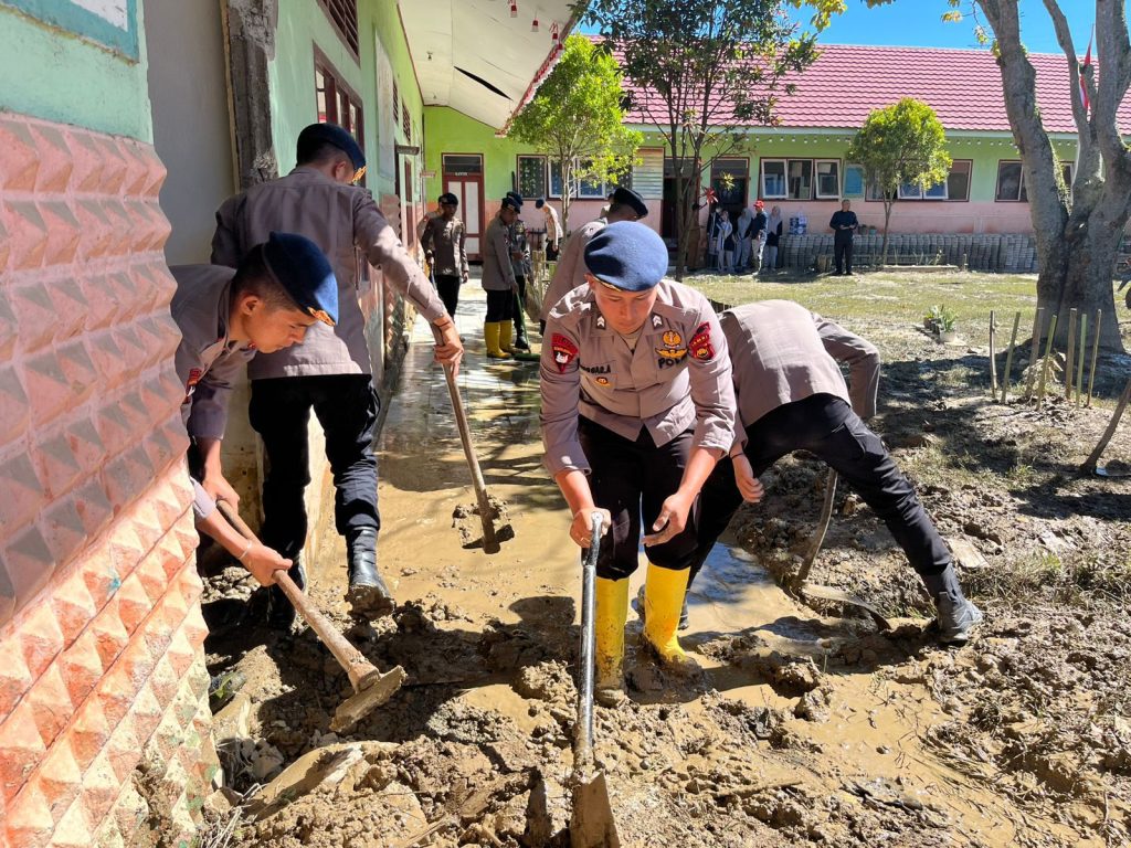 Menindaklanjuti situasi tersebut, Satuan Brimob Polda Jambi Kompi 3 Batalyon B Pelopor diterjunkan ke lokasi pada Senin (01/12/2025). Dipimpin AKP Yulizar selaku Danki 3, personel Brimob turun langsung membantu para guru membersihkan ruang kelas, ruang guru, serta area sekitar sekolah yang dipenuhi material lumpur akibat banjir. Upaya itu disertai pembuatan saluran air agar genangan tidak kembali menumpuk.