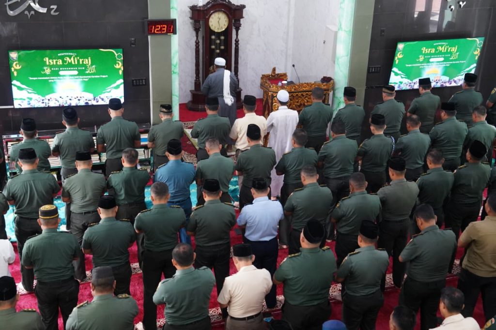 Jurnal1jambi.com,— Segenap Prajurit dan PNS di lingkungan Kodam II/Sriwijaya serta Persit KCK PD II/Sriwijaya menghadiri Acara Peringatan Isra’ Mi’raj Tahun 1447 H/2026 M, bertempat di Masjid Raudhatul Ulum, Makodam II/Sriwijaya, Rabu (21/01/2026). Peringatan Isra’ Mi’raj ini digelar Kodam II/Swj secara sederhana usai Sholat Dzuhur Berjama’ah.