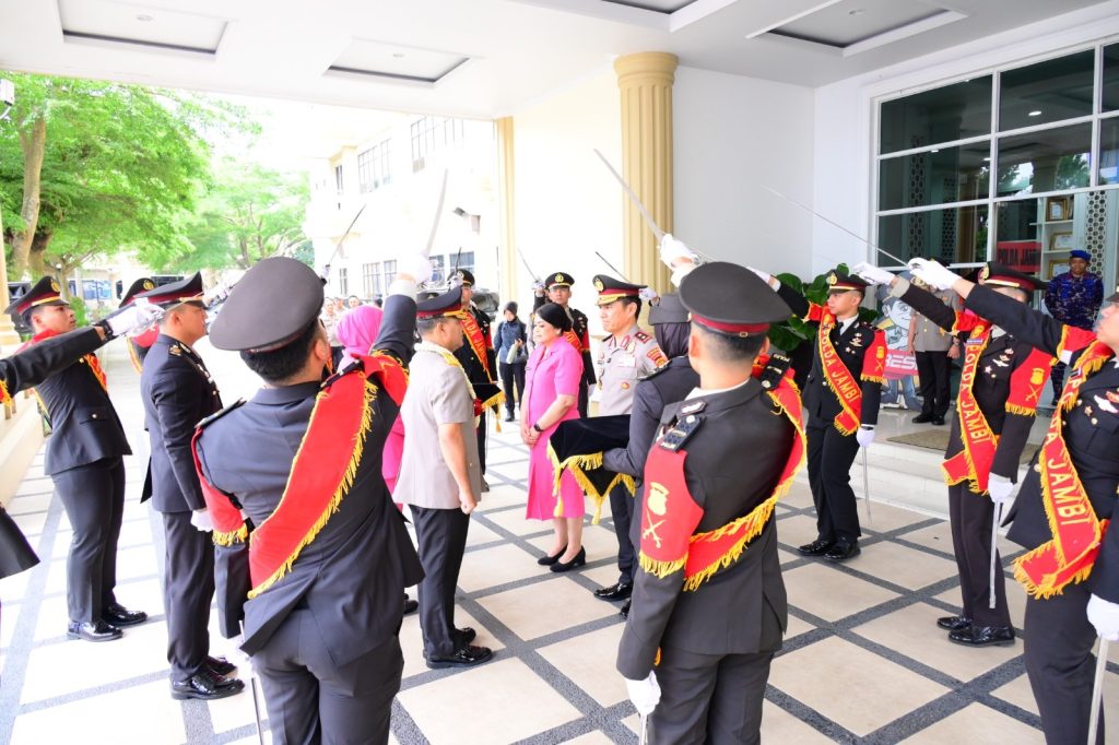 Prosesi tradisi berlangsung khidmat dan sarat makna. Iringan pedang pora mengantar langkah Brigjen Pol. M. Mustaqim saat berpamitan dengan seluruh jajaran, sebagai simbol penghormatan institusi atas dedikasi, loyalitas, dan pengabdian selama menjalankan amanah sebagai Wakapolda Jambi.