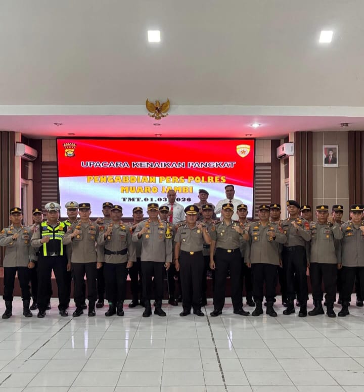 Jurnal1jambi.com,— MUARO JAMBI, Polres Muaro Jambi menggelar upacara kenaikan pangkat pengabdian bagi personel yang telah menunjukkan dedikasi dan loyalitas tinggi selama masa tugasnya. Kegiatan tersebut dilaksanakan di Aula Wira Pratama Polres Muaro Jambi, Senin (02/03/2026), dan dipimpin langsung oleh Kapolres Muaro Jambi AKBP Heri Supriawan, S.I.K., M.H.